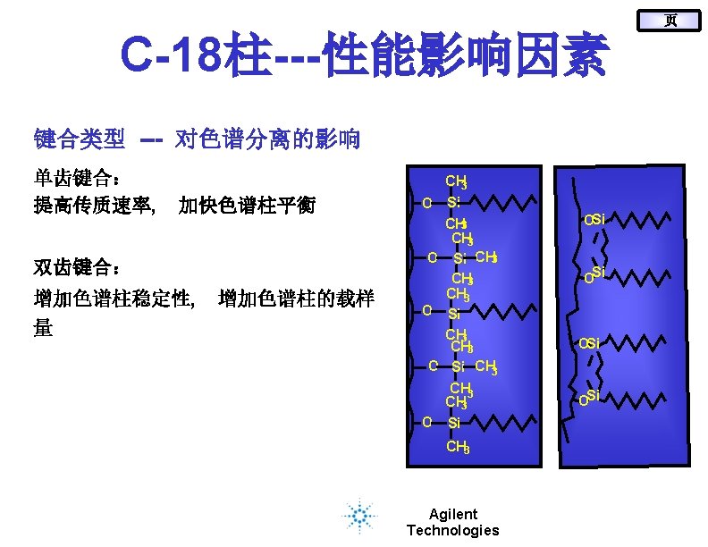 19页 传统键合及封端技术 CH 3 OH OH CH 3 + Cl Si R CH 3 R = C 8, C 18, etc. 固定相键合 二甲基硅烷 O O Si R OH CH 3 O Si R CH 3 + OH Si R CH 3 Cl Si CH 3 O Si CH 3 (TMS) 封端 四甲基硅烷 Agilent Technologies O Si R