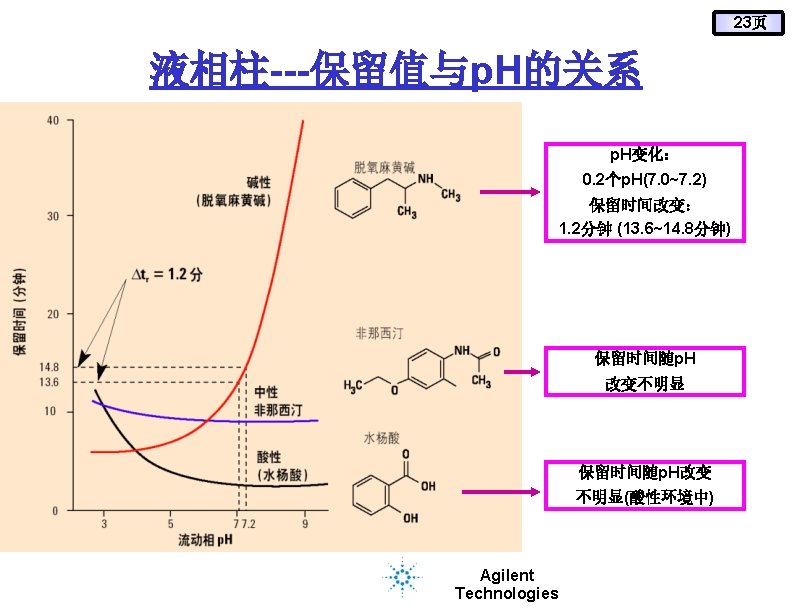21页 液相柱---保留值与p. H的关系 色谱柱:Zorbax Stable. Bond C 18 4. 6 X 250 mm, 5 um 部件号: 880975 -906 流动相: 27%甲醇: 73%磷酸 p. H 2. 5 & 2. 6 温度: 500 C 流速: 1. 0 m. L/min. p. H变化值 0. 1 RS变化值 1. 6 Agilent Technologies