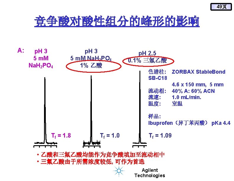 48页 TEA对碱性成分峰形的影响 色谱柱: ZORBAX Eclipse XDB-C 8, 4. 6 x 150 mm, 5 mm 流动相: 85% 25 m. M Na 2 HPO 4 : 15% ACN 流速: 1. 0 m. L/min. 温度: 35°C p. H 7 1 10 m. M TEA 1 No TEA USP TF 5% 1. 1. 29 2. 1. 33 3. 1. 63 4. 2. 35 5. 1. 57 0. 0 样品: 2 3 2. 5 Time (min) 4 5 5. 0 1. Phenylpropanolamine (去甲麻黄碱) 2. Ephedrine(麻黄素) 3. Amphetamine(苯丙胺) 4. Meth. Amphetamine(脱氧麻黄碱) 5. Phenteramine (苯丁胺) 0 4 2. 5 Time (min) Agilent Technologies 5 USP TF 5% 1. 1. 19 2. 1. 18 3. 1. 20 4. 1. 26 5. 1. 14 5. 0