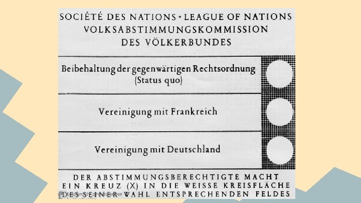 Objectives People of Saar held plebiscite to decide their future 1. Remain under League control 2. Return to Germany 3. Become part of France