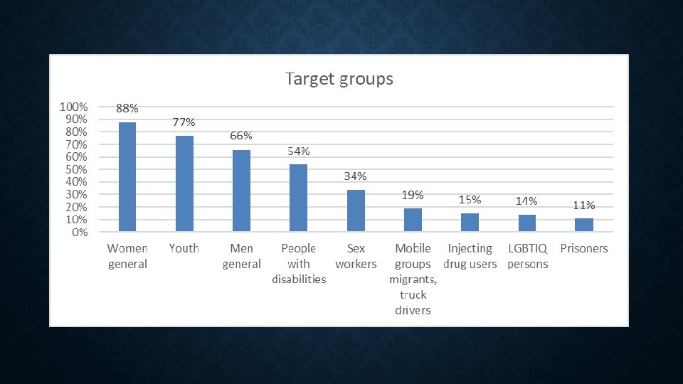 NEXT STEPS • Only 14 of the 75 case studies in this category focused primarily on HIV and AIDS. This is very low and might be indicative of fatigue around HIV and AIDS. This problematic as • In contrast there were relatively high numbers of submissions on GBV. The challenge is despite all the good practices levels of GBV are not decreasing. Moving forward there needs to be an analysis of what works in the short, medium and long term to prevent all forms of GBV. • Levels of maternal mortality in the SADC is unacceptably high. More initiatives are required to demand better quality, accessible and an increase in reproductive health services. • A glaring absence in the case studies was on sexual harassment. None of the case studies focused on sexual harassment. This is particularly concerning during a time when the issue was so prominent with launch of the global Me. Too campaign. • Issues of sexual and reproductive health and rights are particularly significant for sex workers and LGBTIQ persons. Both groups face stigma and discrimination within communities and when accessing services.