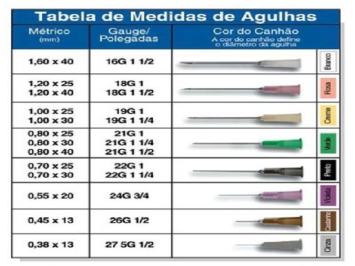AGULHAS INTRADÉRMICA (ID): • 13 x 3, 8 SUBCUT NEA (SC): • 13 x 4, 5 INTRAMUSCULAR (IM): • 20 x 5, 5: até 5 kg • 25 x 6, 0: > 5 kg • 25 x 7, 0: a depender do físico do paciente Saúde Coletiva