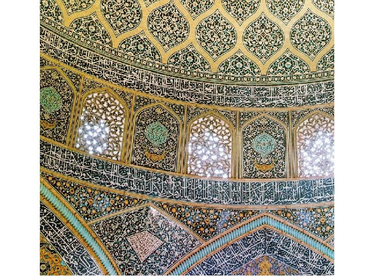 • • • Safavid Art in Iran (c. 1502 -1736) In the late 16 th century, the Safavid capital was established at Isfahan, in the heart of ancient Persia, where it became the centre of eastern Muslim art and culture for almost two centuries. Isfahan Safavid architecture is exemplified by the domed mosque of Shaykh Lutfullah (1603 -18) and the Great Mosque of Shah Abbas (1612 -20) (Masjid-i Shah). Advances in Safavid painting - including, brightly coloured stylized imagery as well as a highly realist style of figurative drawing - came predominantly from the schools of Tabriz, Herat, Bukhara and Kasvin. In the decorative arts, Safavid artists excelled in all areas of the book - like gilding, illumination, calligraphy and lacquer-painted leather bookbinding. Also in carpet-design, the Safavid period saw the replacement of Turkish abstract patterns by new floral and figurative designs. Also, advances were made in ceramic art, due in part to the influence of Chinese porcelain. Persian Safavid art is noted for its architecture, its decorative designwork (eg. knotted rugs, silk-weaving) and its figurative painting. The latter, in particular, gave rise to a richness and variety almost unparalleled in Islamic art, and led to the emergence of individual artists and the creation of personal styles.