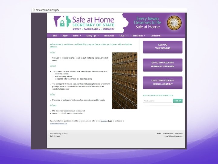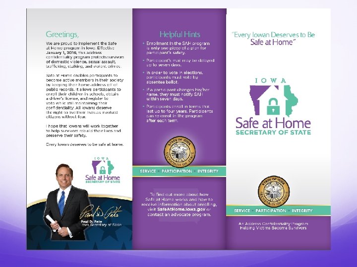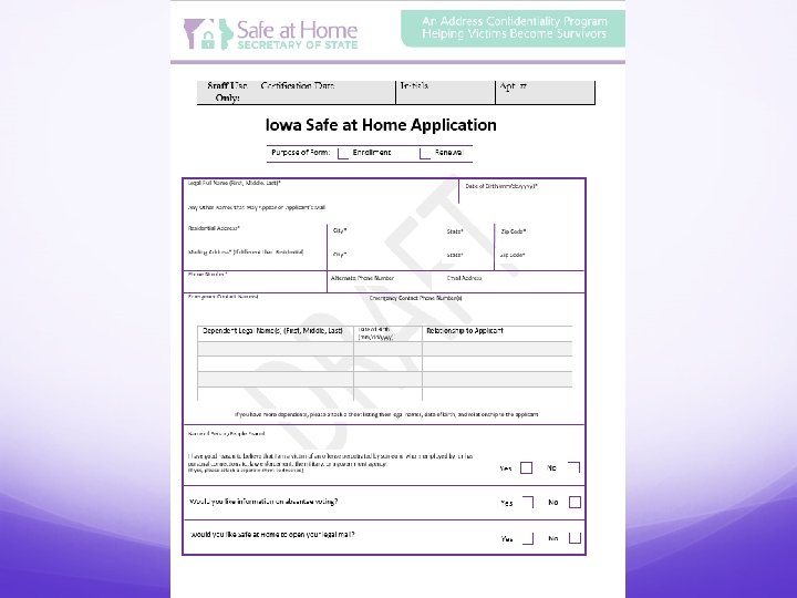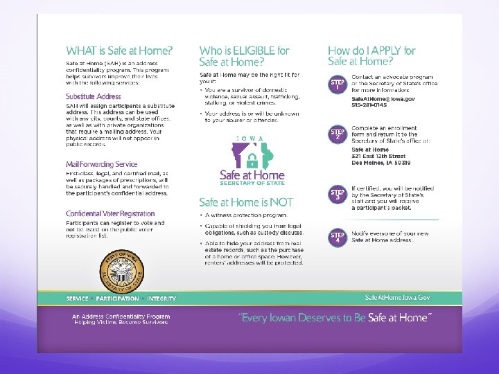 How Do Survivors Apply? Victims or survivors must complete application forms provided by the Secretary of State. Applications will be available via: Application assistants across Iowa. Online at www. Safe. At. Home. iowa. gov. Anticipating Applications to be available mid-December.