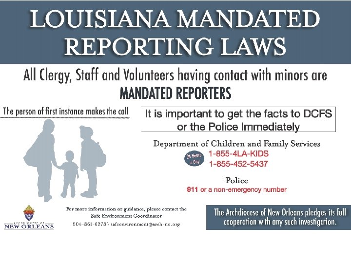 Louisiana Criminal Code Article Revised Statute 14: 403 All employees and volunteers who are supervising children and youth ARE mandated reporters Tree given to Archbishop Gregory Aymond in memory of a three year old child who died as a direct result of child abuse 2015 day a rs u o ek h e w 4 2 s a y a 7 d