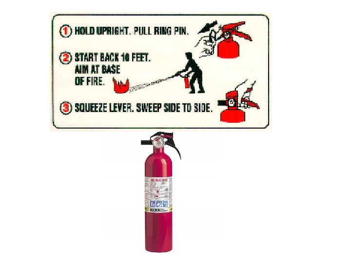 Fire Extinguisher P. A. S. S • Pull the Pin at the top of the extinguisher. The pin releases a locking mechanism and will allow you to discharge the extinguisher • Aim at the base of the fire, not the flames. This is important - in order to put out the fire, you must extinguish the fuel • Squeeze the lever slowly. This will release the extinguishing agent in the extinguisher. If the handle is released, the discharge will stop. • Sweep from side to side. Using a sweeping motion, move the fire extinguisher back and forth until the fire is completely out. Operate the extinguisher from a safe distance, several feet away, and then move towards the fire once it starts to diminish. Be sure to read the instructions on your fire extinguisher - different fire extinguishers recommend operating them from different distances. Remember: Aim at the base of the fire, not at the flames!