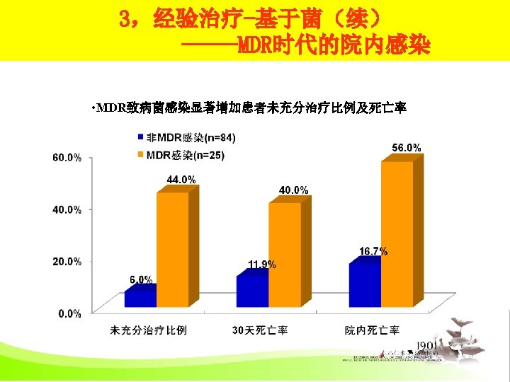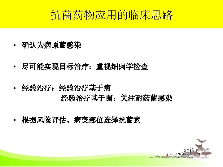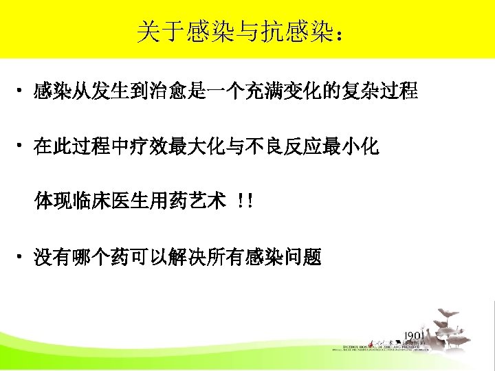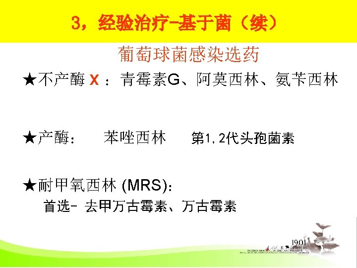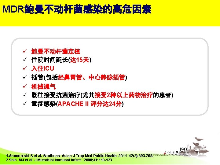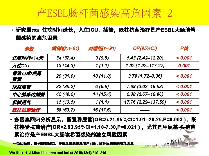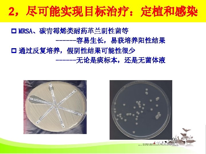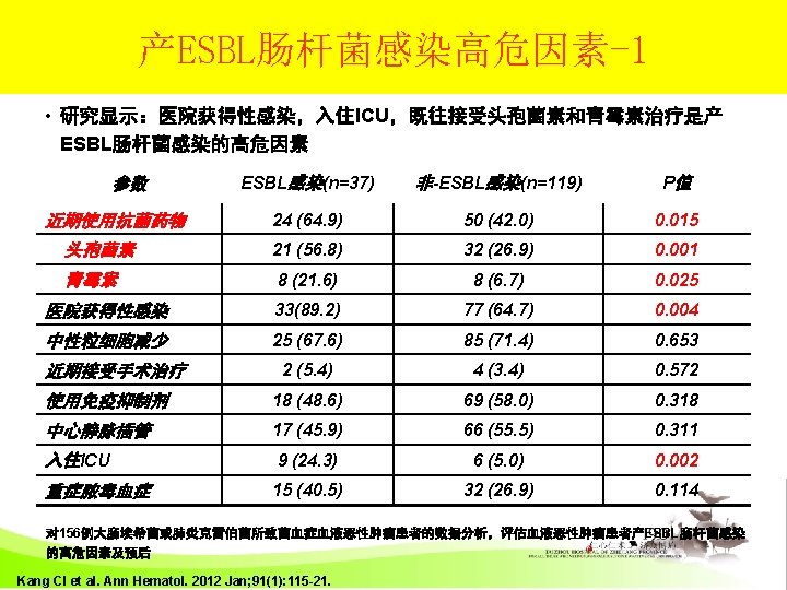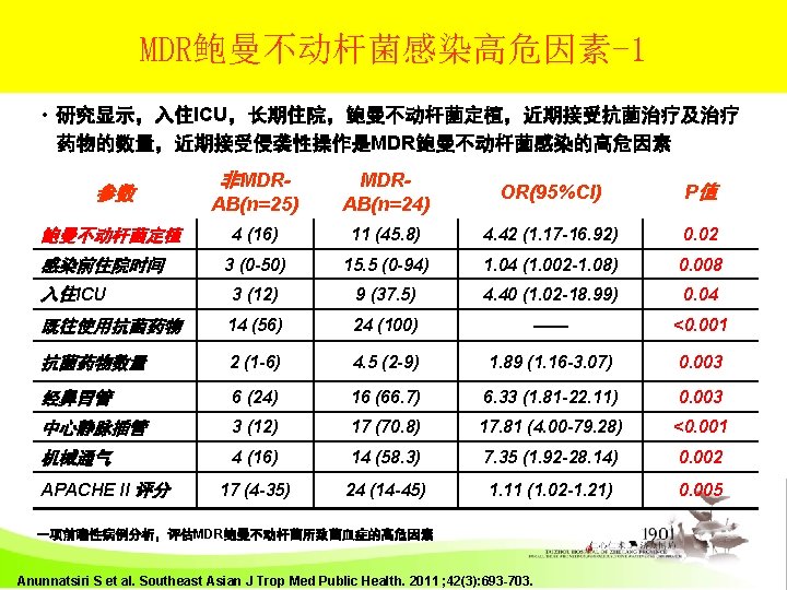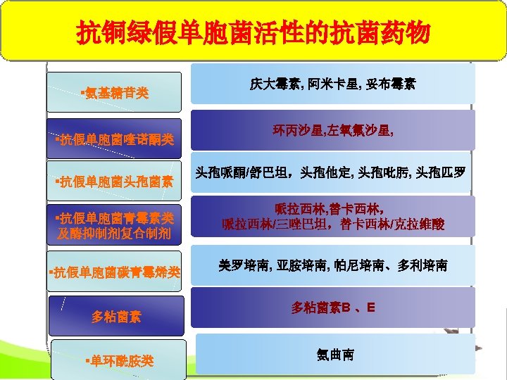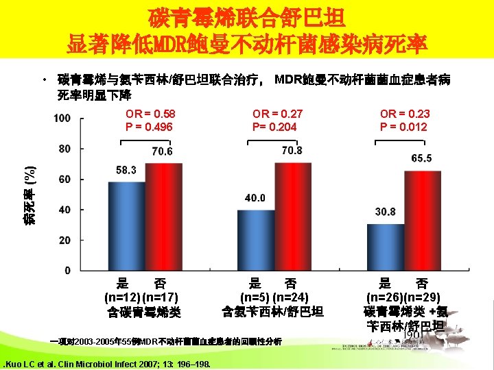 Safety Efficacy Economic Convenience MRSA MRSA OR 95CI Slides: 49 Download presentation 合理用药 目标 Safety 安全 Efficacy Economic 有效 经济 Convenience 方便 MRSA感染的高危因素 MRSA感染高危因素的多因素回归分析 OR 95%CI P值 导管 7. 109 1. 983~25. 285 0. 002 近期接受抗菌治 疗 5. 078 1. 433~17. 999 0. 012 开放创口 6. 985 2. 710~18. 005 < 0. 001 皮质激素 4. 652 1. 0579~13. 709 0. 005 参数 BMC infect dis , 2011, 11: 303 产ESBLs菌株血行感染: 不同抗菌药物经验性治疗疗效比较 存活率 • 不同抗菌药物治疗方案30天病死 率比较 :Thirty-day mortality rates – 碳青霉烯类 12. 9% (8 of 62) – 头孢菌素 26. 9% (7 of 26) – 氨基糖苷类 26. 9% (7 of 26) 选择碳青霉烯类抗生素作 为产ESBLs菌株感染的经 验性治疗的合理性! Bloodstream Infections Due to Extended-Spectrum Beta-Lactamase-Producing Escherichia coli and Klebsiella pneumoniae: Risk Factors for Mortality and Treatment Outcome, with Special Emphasis on Antimicrobial Therapy. AAC. 2004, 48, (12), p. 4574– 4581 多药联合治疗降低铜绿感染死亡率 100 90 80 死亡率 (%) 70 60 79. 41 68. 18 46. 51 50 40 26. 57 30 20 44. 44 40 联合用药 单药治疗 26. 83 26. 67 14. 29 13. 33 10 0 Tapper Hilf Mendelson Igra Kuikka Does combination antimicrobial therapy reduce mortality in Gram-negative bacteraemia A meta-analysis Lancet Infect Dis 2004; 4: 519– 27