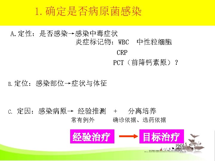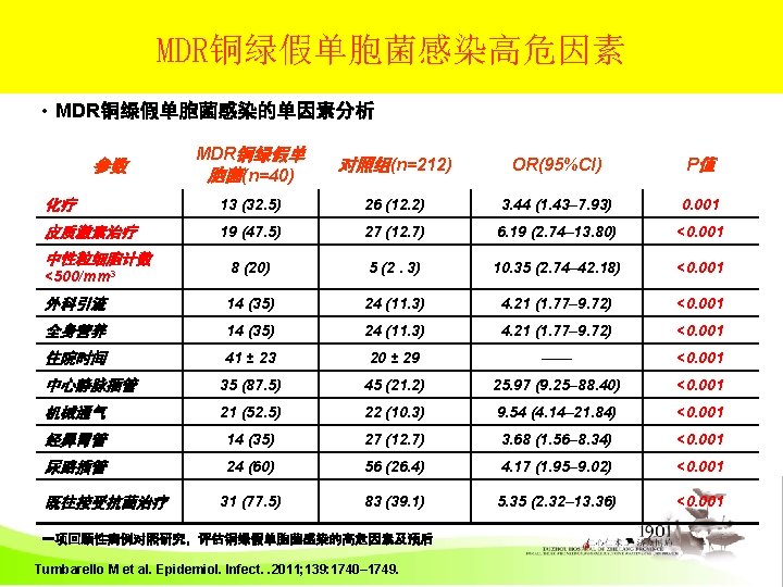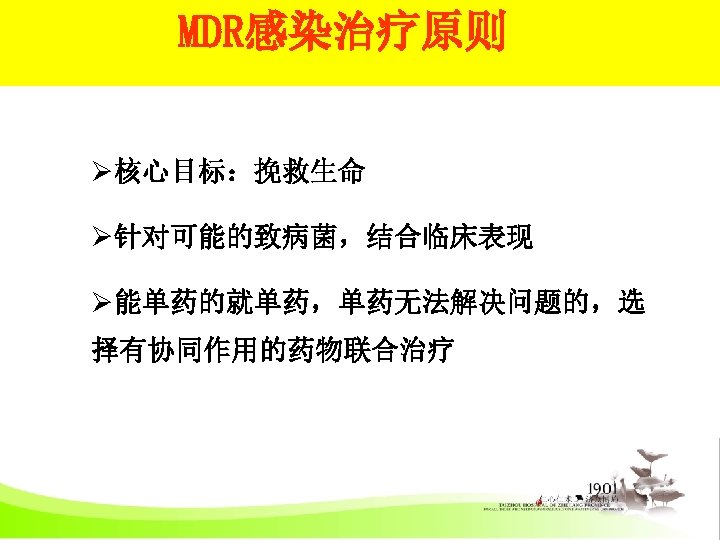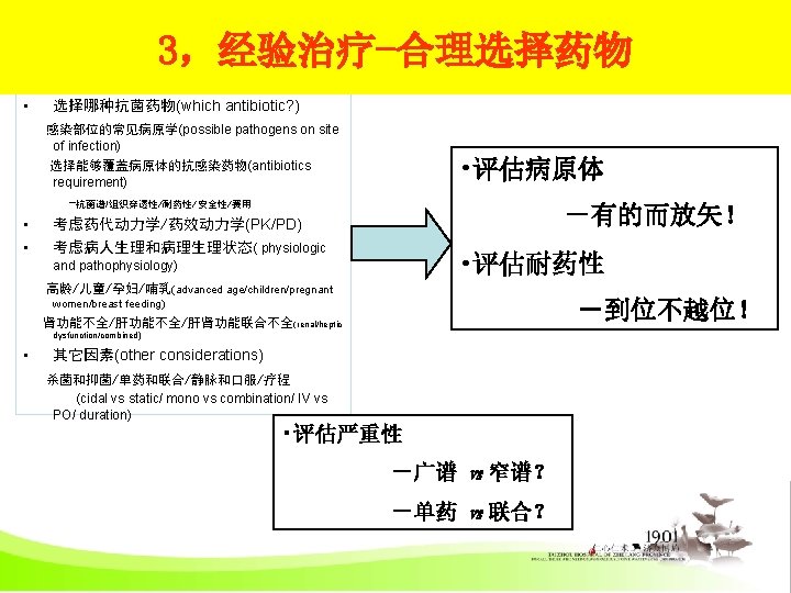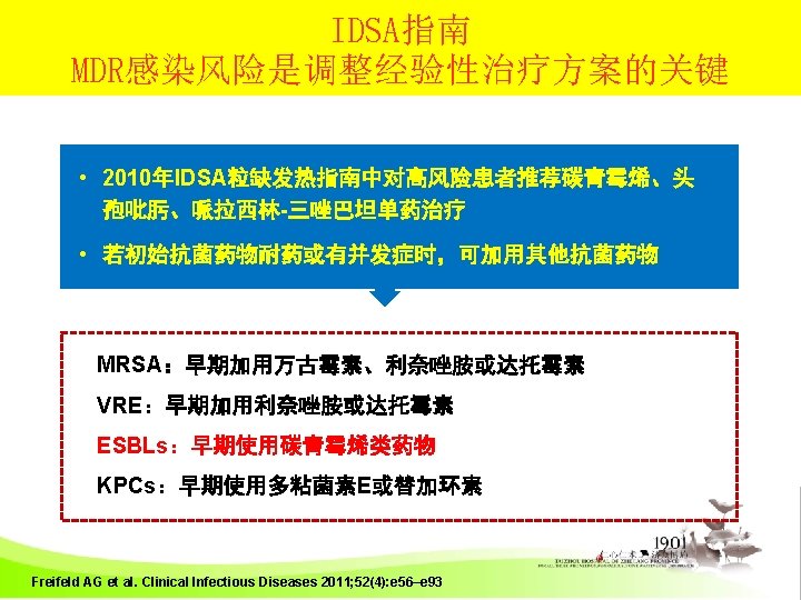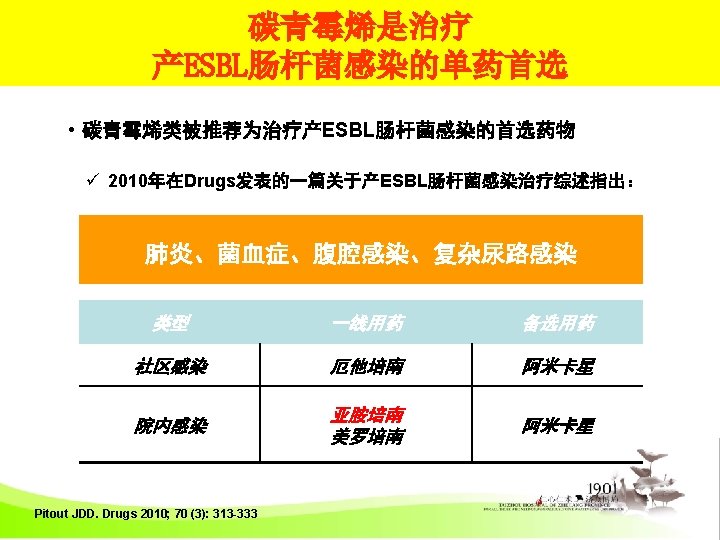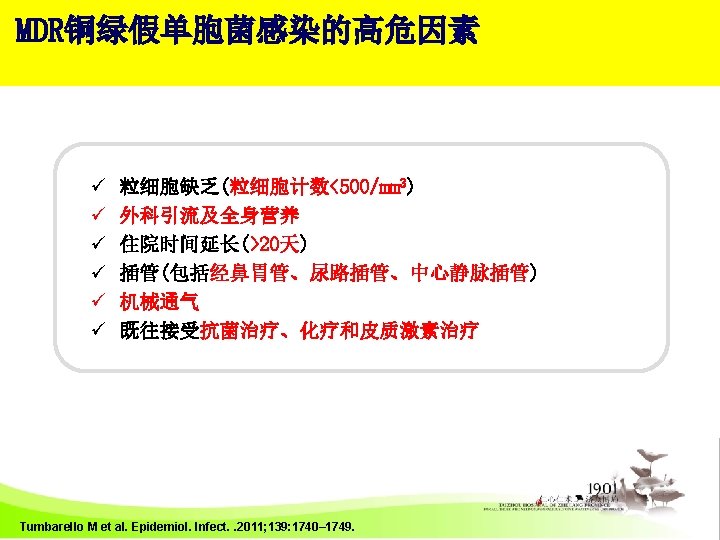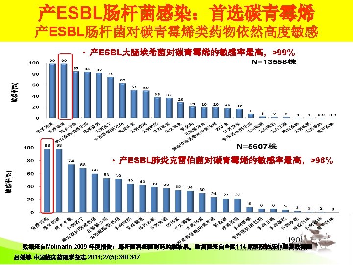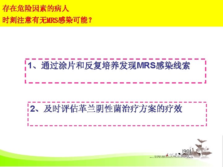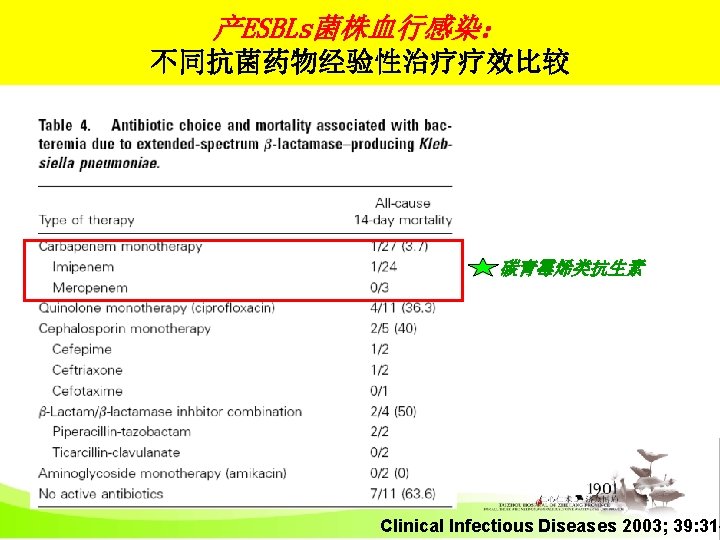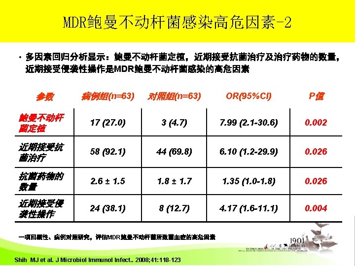 Safety Efficacy Economic Convenience MRSA MRSA OR 95CI Slides: 49 Download presentation 合理用药 目标 Safety 安全 Efficacy Economic 有效 经济 Convenience 方便 MRSA感染的高危因素 MRSA感染高危因素的多因素回归分析 OR 95%CI P值 导管 7. 109 1. 983~25. 285 0. 002 近期接受抗菌治 疗 5. 078 1. 433~17. 999 0. 012 开放创口 6. 985 2. 710~18. 005 < 0. 001 皮质激素 4. 652 1. 0579~13. 709 0. 005 参数 BMC infect dis , 2011, 11: 303 产ESBLs菌株血行感染: 不同抗菌药物经验性治疗疗效比较 存活率 • 不同抗菌药物治疗方案30天病死 率比较 :Thirty-day mortality rates – 碳青霉烯类 12. 9% (8 of 62) – 头孢菌素 26. 9% (7 of 26) – 氨基糖苷类 26. 9% (7 of 26) 选择碳青霉烯类抗生素作 为产ESBLs菌株感染的经 验性治疗的合理性! Bloodstream Infections Due to Extended-Spectrum Beta-Lactamase-Producing Escherichia coli and Klebsiella pneumoniae: Risk Factors for Mortality and Treatment Outcome, with Special Emphasis on Antimicrobial Therapy. AAC. 2004, 48, (12), p. 4574– 4581 多药联合治疗降低铜绿感染死亡率 100 90 80 死亡率 (%) 70 60 79. 41 68. 18 46. 51 50 40 26. 57 30 20 44. 44 40 联合用药 单药治疗 26. 83 26. 67 14. 29 13. 33 10 0 Tapper Hilf Mendelson Igra Kuikka Does combination antimicrobial therapy reduce mortality in Gram-negative bacteraemia A meta-analysis Lancet Infect Dis 2004; 4: 519– 27