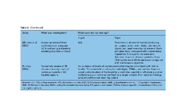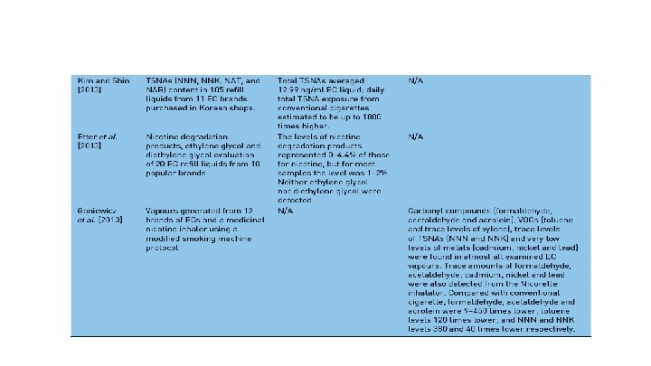 • Therefore, the risk for bystanders would be literally nonexistent. • They observed that the half life of EC aerosol was 11 seconds compared with 20 minutes for cigarette smoke. • ECs may emit detectable amounts of nicotine (depending on the specific EC brand tested), but no carbon monoxide and volatile organic carbons. However, the average ambient levels of nicotine of ECs were 10 times lower than those of conventional cigarettes (3. 32 � } 2. 49 versus 31. 60 � } 6. 91 μg/m 3). • Researchers found significant adverse effects in spirometry parameters after being exposed to passive smoking for 1 hour, while no adverse effects were observed after exposure to passive vaping.