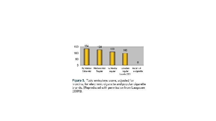 Passive vaping • Passive smoking is an established risk factor for a variety of diseases. • the potential of any significant adverse effects of EC on bystanders is minimal. • aerosol is produced only during activation of the device, while tobacco cigarettes emit smoke even when no puffs are taken. • emissions from an EC only formaldehyde, acrolein, isoprene, acetaldehyde and acetic acid were detected. – The levels were 5– 40 times lower compared with emissions from a conventional cigarette. • Characteristically, the amount of TOC accumulated after 5 hours of EC use was similar to the amount found after just 11 minutes of smoking.