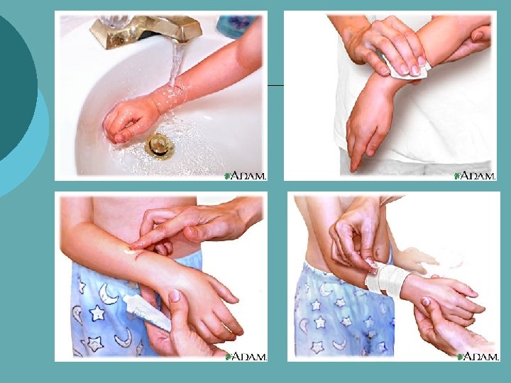 First aid box Well stocked Conveniently placed Out of reach of children Clean and tidy Antiseptic Cotton wool Scissors Plasters Sterile bandage Sterile dressing Burn-spray Safety pins Thermometer Tweezers Surgical gloves