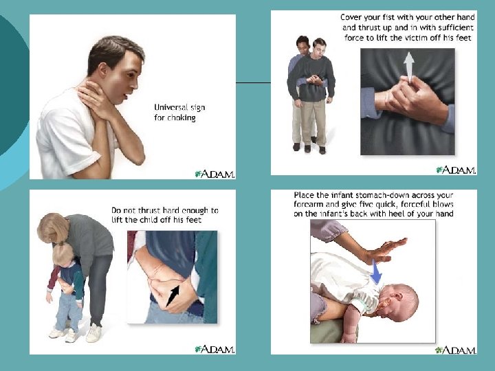 Choking Caused by a blockage in the airways, victim cannot breath. First aid must be given quickly. Children: Place the child face down over your knees, support head with one hand Slap child 4 times between shoulder blades. Adults: Use Heimlich manoeuvre. Stand behind victim, clasp hands under rib cage, pull hands sharply in and upwards, repeat as necessary.