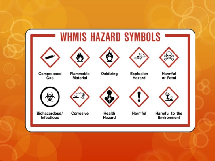 WHMIS SYMBOLS The Workplace Hazardous Materials Information System (WHMIS) has produced symbols for hazardous products found in the workplace. WHMIS symbols are similar to HHPS symbols, but are always in a diamond (except biohazard) WHMIS symbols identify a wider range of hazards than HHPS symbols