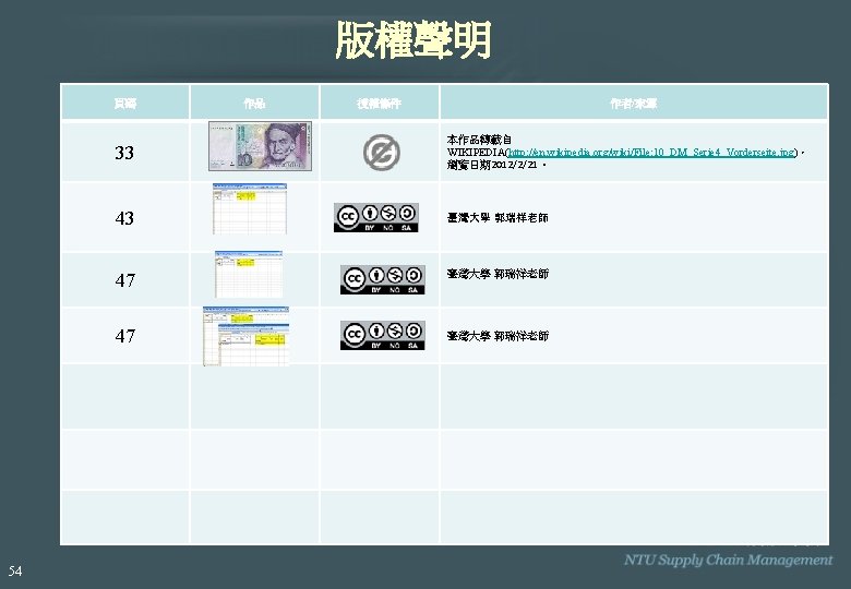 版權聲明 頁碼 53 作品 授權條件 作者/來源 5 本作品轉載自Cool. CLIPS網站 (http: //dir. coolclips. com/Popular/World_of_Industry/Food/Shopping_cart_full_of_gr oceries_vc 012266. html ),瀏覽日期 2011/12/28。依據著作權法第 46、52、65條 合理使用。 6 本作品轉載自 WIKIPEDIA(http: //en. wikipedia. org/wiki/File: Palm-m 505. jpg),瀏 覽日期 2012/2/21。 6 本作品轉載自Microsoft Office 2007多媒體藝廊,依據Microsoft 服務合約及著 作權法第 46、52、65條合理使用。 19 臺灣大學 郭瑞祥老師 22 臺灣大學 郭瑞祥老師