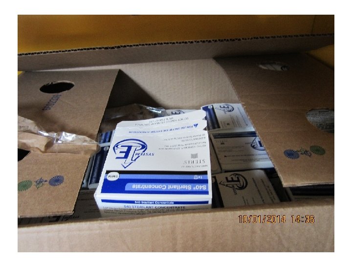 Location: Hazardous Waste Accumulation Area Waste: This box holds approximately thirty smaller containers of S 40 sterilant consisting of 35% peracetic acid. Dangerous Waste Violations: • Lack of a “dangerous waste” or “hazardous waste” label. • Lack of a risk label. • Lack of an accumulation start date. • Waste accumulated without proper segregation. Peracetic acid is a corrosive organic acid. This container is located within the flammable cabinet. Corrosive organic dangerous wastes and flammable dangerous wastes must be kept separate.