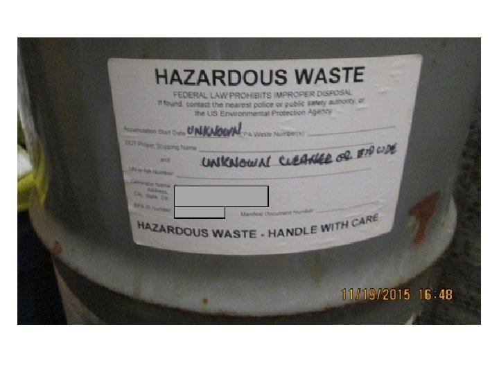 Location: Hazardous Waste Accumulation Area Waste: “Unknown Cleaner or ETO Cide” Dangerous Waste Violations: • Lack of a risk label. • Lack of an accumulation start date.