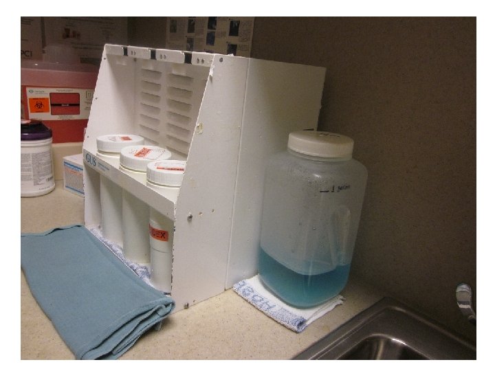 Location: Ultrasound Instrument Cleaning Station Waste: The blue solution is Cidex waste. Dangerous Waste Violations: • Lack of a “dangerous waste” or “hazardous waste” label. • Lack of a risk label.