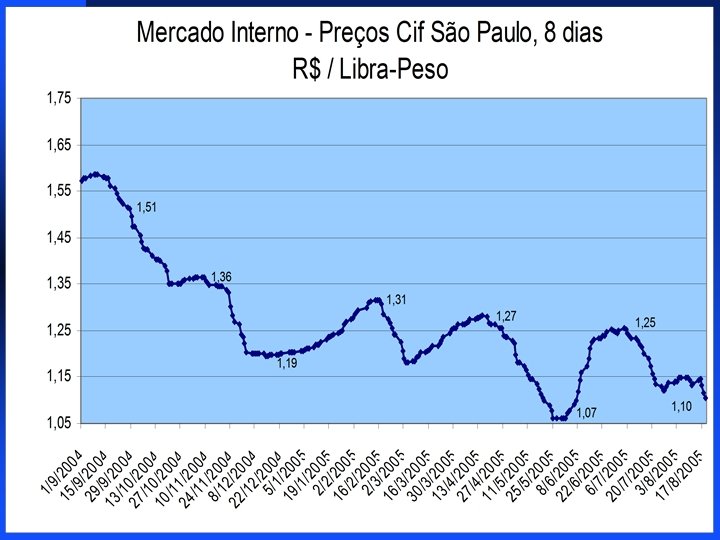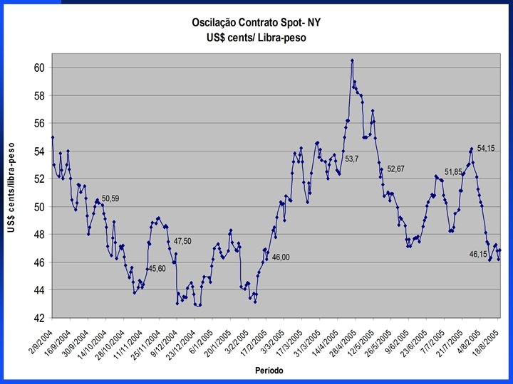 TENDÊNCIA P/ 2005/2006 n n n PROJEÇÕES INDICAM CENÁRIO DE PREÇOS UM POUCO MAIS FIRMES PARA A TEMPORADA 2005/2006 MERCADO DE CLIMA DO HEMISFÉRIO NORTE (AGOSTO /SETEMBRO)AINDA EM 2005 SERÁ FUNDAMENTAL PARA REALIZAÇÃO DE NEGÓCIOS PARA ENTREGA EM 2006 CONTRATOS DE OUTUBRO/DEZ/05, EM NÍVEIS DE US$ 54, 00 – US$ 55, 00 CENTS/LIBRA-PESO: “START” PARA ABERTURA DE NEGÓCIOS A PATAMARES DE US$ 50, 00 A US$ 51, 00 C/LIBRA-PESO, FOB PARANAGUÁ.