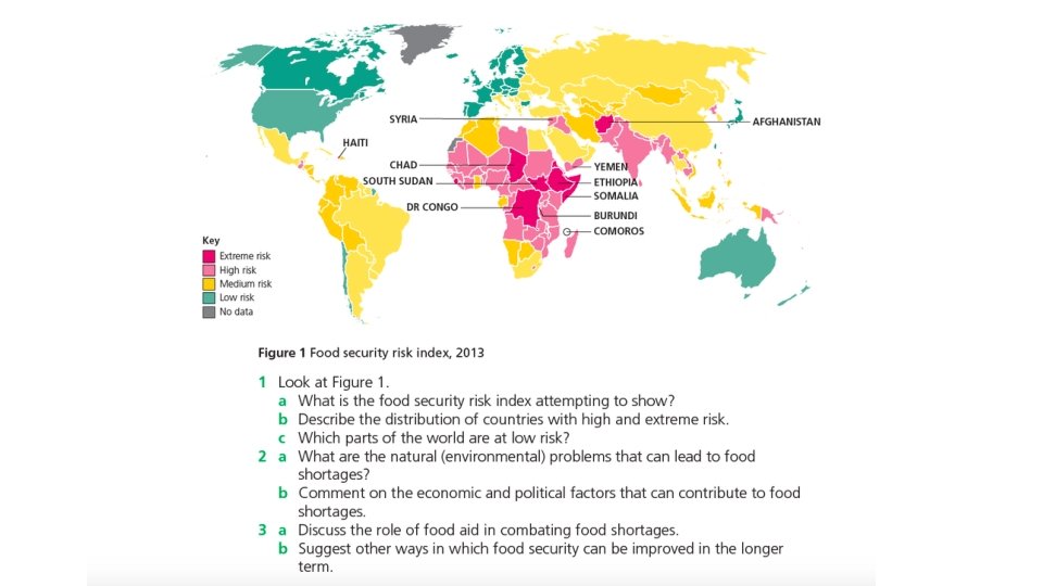 Examples of 7 mark questions • 2013: For a named area or country you have studied which suffers from food shortage, explain why there is a shortage of food. [7] • 2016: For a named country or region you have studied, describe the effects of food shortages on the people who live there. [7] • 2007: In many parts of the world the natural environment presents hazards to people. Choose an example of a drought. For a named area, describe the short-term and long-term effects of the example which you have chosen on people living in the area. [7]