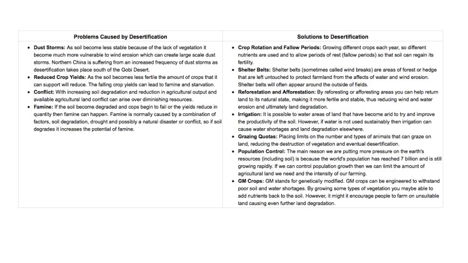 Population growth in desert fringe areas, as in other places, has two components; ü Population growth remains very high in the poorest parts of the Sahel, for reasons linked with poverty, such as lack of education. There were just 30 million people living in the Sahel in 1950. Today the figure is closer to half a billion. By 2050, it is expected to reach one billion. Most of this growth is cause by the high number of children being born, and people living longer than they did in the past. ü Migration brings even greater population pressure. Drought and desertification in one region will displace people to another fragile environment. Desertification occurs there too, as the number of people increases, so the problem gets spread from place to place. In addition to climate change refugees, millions of people have been forced to move into desert fringe areas by armed conflicts in the Sahel region.