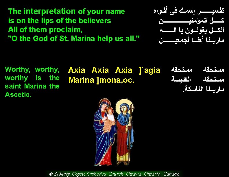 Her virtues then appeared, and Satan perceived her light, while everyone was magnifying her, Marina the Ascetic. The accursed Satan was defeated, in his snares and transgressions, her body was brought there, Marina the Ascetic. The guilty confessed their crime, and their plot was exposed, and everyone was appalled, Marina the Ascetic. ﻇﻬﺮﺕ ﻓﻀﺎﺋﻠﻬﺎ ﻭﺍﻟﻀﺮﻳﺮ ﺃﺒﺼﺮ ﻧﻮﺭﻫﺎ ﻭﺍﻟﻜﻞ ﻳﻄﻮﺑﻬﺎ ﻣﺎﺭﻳﻨﺎ ﺍﻟﻨﺎﺳﻜﺔ ﺻﺮﻉ ﺍﻟﺸﻴﻄﺎﻥ ﺍﻟﻠﻌﻴﻦ ﺍﻟﺨﺎﻃﻴﺔ ﻭﺍﻷﺜﻴﻢ ﺣﻀﺮﻭﺍ ﻟﺠﺴﺪﻫﺎ ﻓﻲ ﺍﻟﺤﻴﻦ ﻣﺎﺭﻳﻨﺎ ﺍﻟﻨﺎﺳﻜﺔ ﺍﻋﺘﺮﻓﻮﺍ ﺑﺠﺮﻳﻤﺘﻬﻢ ﻭﺍﻧﻔﻀﺤﺖ ﻣﺆﺎﻣﺮﺗﻬﻢ ﻭﺍﻟﻜﻞ ﻓﻲ ﺫﻫﻮﻟﻬﻢ ﻣﺎﺭﻳﻨﺎ ﺍﻟﻨﺎﺳﻜﺔ © ST. Mary Coptic Orthodox Church, Ottawa, Ontario, Canada