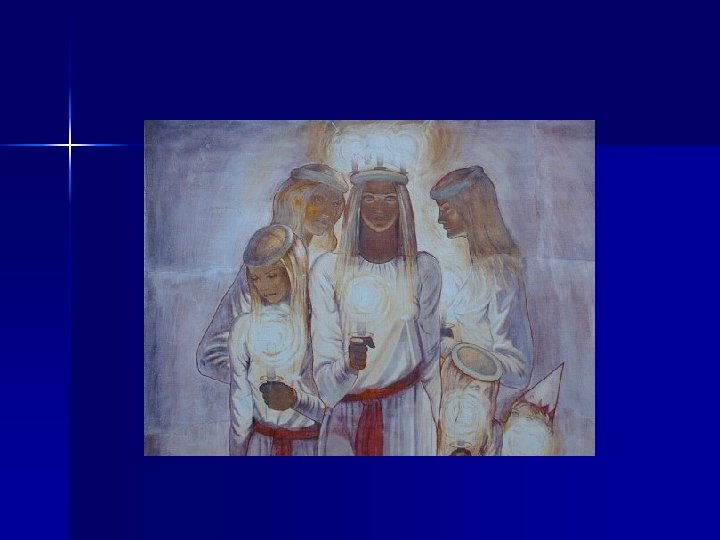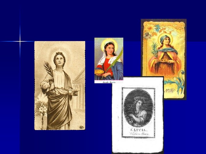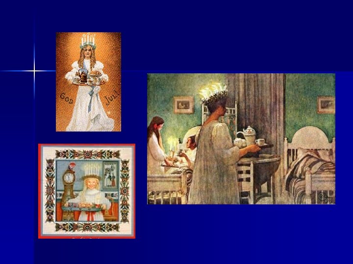 St. Lucia was a Roman young woman who became a Christian martyr about 300 AD. Lucia gave her dowry to poor Roman Christians on her wedding day, was condemned as a traitor, and was to be burned at the stake. The flames did not harm her, so her executioners killed her with a sword. Years later, when Sweden was suffering from famine and despair, legend tells how St. Lucia appeared one cold and dark winter night and brought food and light to the people of Sweden. A similar thing happened in Italy. There was a famine, and families gathered in a cathedral on her feast day, Dec. 13 th, to pray. Legend says two ships showed up with wheat, Lucia at the helm. She was dressed in white with candles on her head. (St. Lucia is the patron saint for fishermen and is said to guide them home during rough seas. )