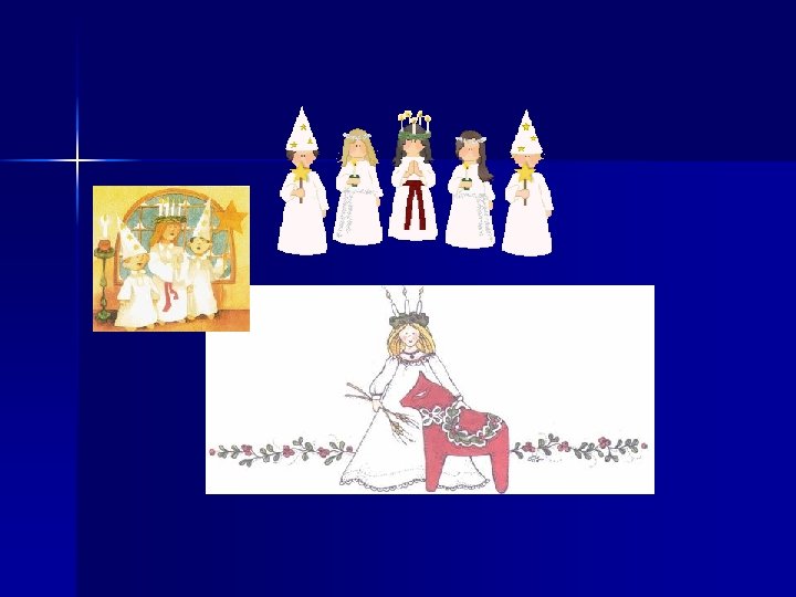 There are now also boys in the procession, playing different roles associated with Christmas. Some may be dressed in the same kind of white robe, but with a coneshaped hat decorated with golden stars, called "stjärngossar" (star boys); some may carry lanterns; and some may be dressed up as gingerbread men. They participate in the singing and also have a song or two of their own, usually one telling about St. Stephen, the first Christian martyr, caring for his five horses.