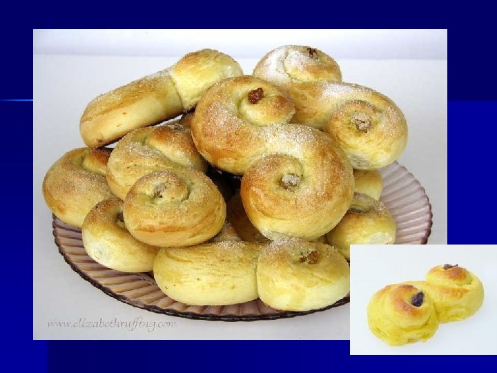 A Saint Lucia coffeecake is the traditional offering on Dec. 13 th. The rich dough is colored and flavored with saffron. Either a large wreath or a plate of individual buns — formed in the shapes of wreaths, crowns and cats — is used for holiday feasts or given to guests who come to call.