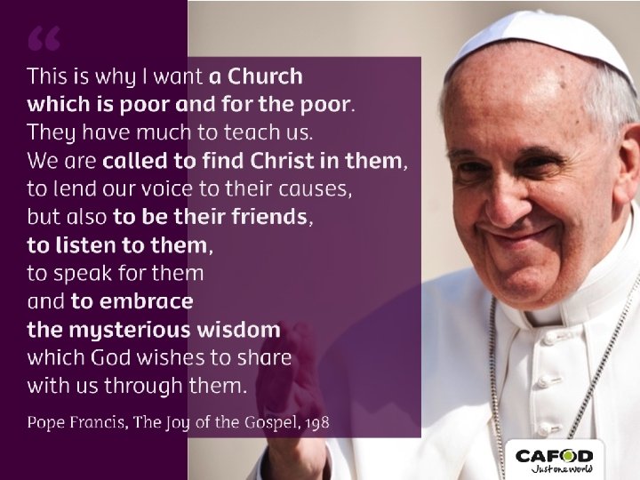 “ We want a Church that is really side by side with the poor … We find that we are gradually uncovering the genuine face of the Suffering Servant of God. We are getting to know closer at hand the mystery of the Christ who becomes human and becomes poor for us. Saint Oscar Romero