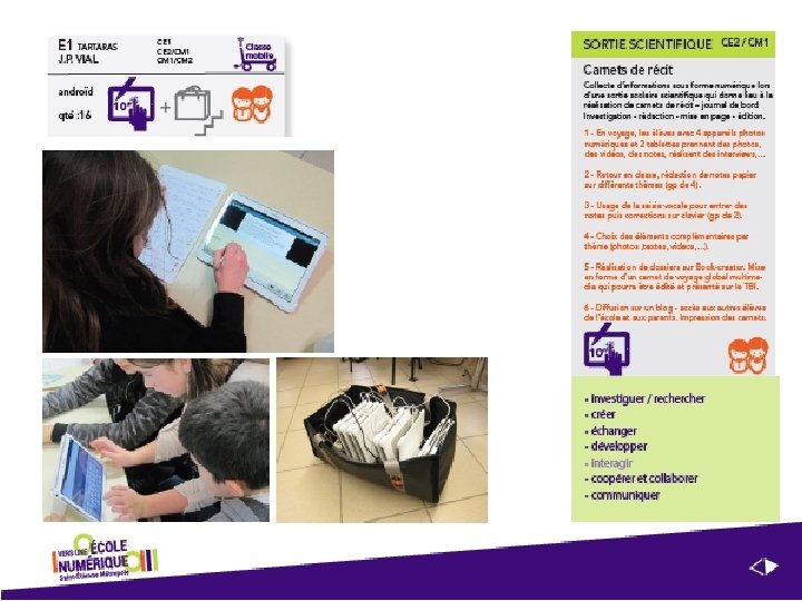 LA MÉTHODOLOGIE Temps 1 : • État de l’art (6 mois) : matériels, espaces, pédagogies • Étude des usages (3 mois) : matériel et contenu numérique, espaces, pédagogies, formation, maintenance, réseau, extérieur Temps 2 : Je participe à l’évolution numérique de mon école ! (3 mois) Des enseignants inquiets mais conscients du dynamisme apporté par le numérique. Des apprentissages en mode projet. Des ateliers adaptés, phasés sur plusieurs semaines Temps 3 : Laboratoire de conception (1 mois ) : Temps 4 : Tests (2 mois) : des écoles en autonomie, des écoles avec modification des conditions d’usage, de nouvelles écoles utilisatrices. Temps 5 : Livraison préconisation rendu final (3 mois, en cours) Temps 6 : Valorisation LES ÉCOLES, L’ÉQUIPE DE DESIGNERS ET LES PARTENAIRES : UNE ÉTROITE COLLABORATION
