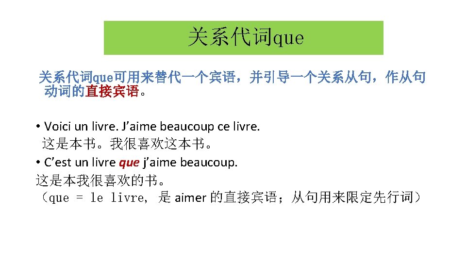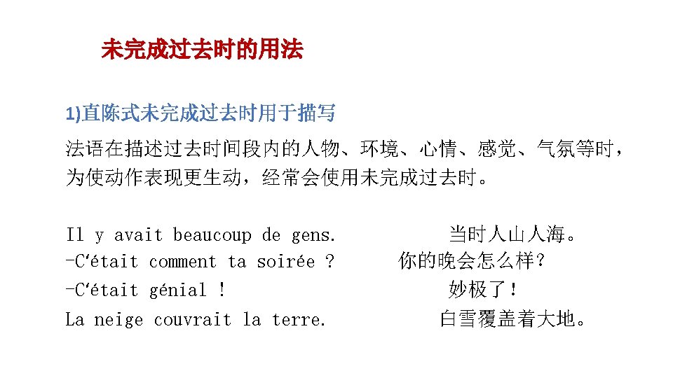 直陈式未完成过去时(l'imparfait de l'indicatif) 1) 直陈式未完成过去时的构成: 动词去掉直陈式现在时第一人称复数变位的词尾 -ons, 另换词尾 -ais, -ait, -ions, -iez, -aient,即构成该动词直陈 式未完成过去时的变位形式。 habiter jʼhabitais tu habitais il habitait elle habitait exercices: (nous habitons) nous habitions vous habitiez ils habitaient elles habitaient acheter aller prendre