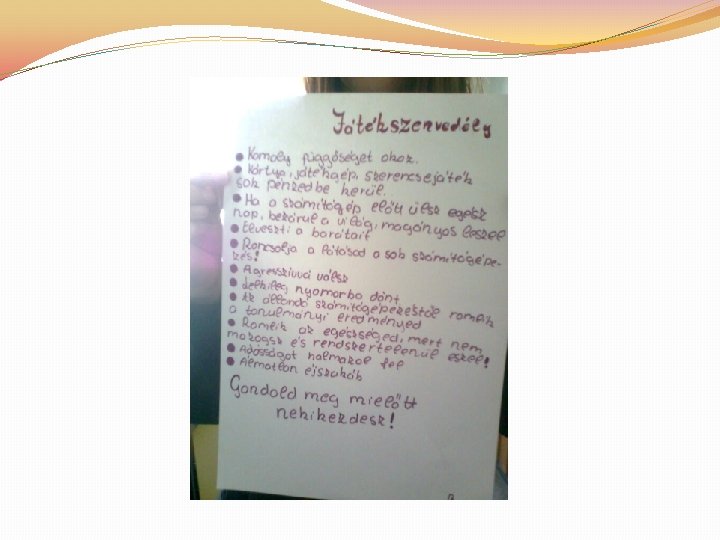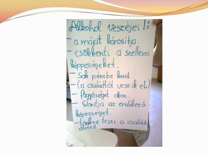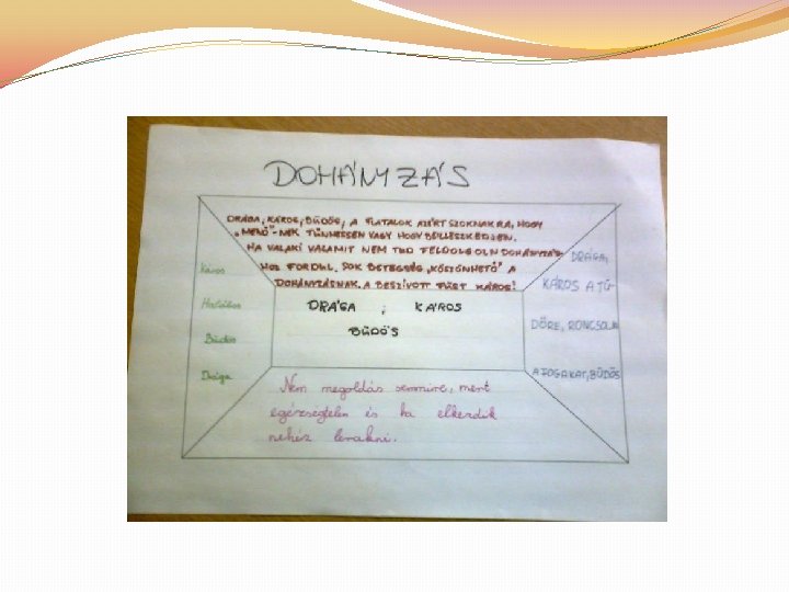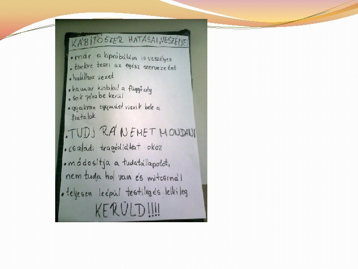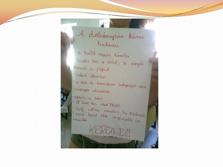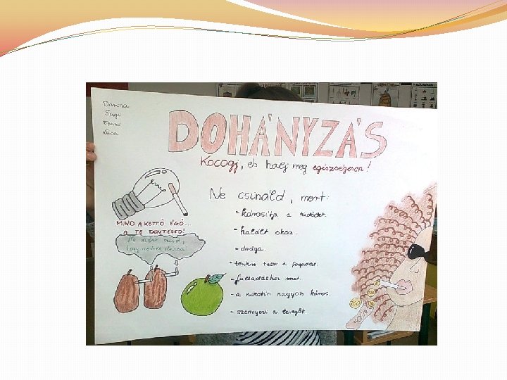 Értékelés : �A tanulók jó hangulatban végezték a munkájukat, érdeklődőek, nyitottak voltak a téma iránt. Aktívak, együttműködőek voltak a csoportmunkák elkészítése során. Szívesen mutatták meg az elkészült plakátokat, figyelemfelhívó írásaikat a diáktársaiknak. A kitűzött célokat megvalósítottuk.