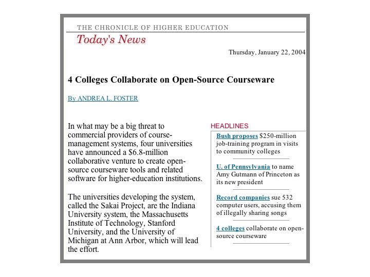 More History • Different outreach approaches – UM Workshops since 2002 - 30 sites attended – Course. Work adopted at 5 sites • Mellon-funded technology projects nearing completion – u. Portal - highly successful - 300 installations – OKI - Community development of LMS API specifications