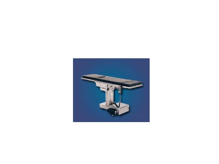 MESA DE CIRUGIA • Permiten diferentes posiciones para facilitar la accesibilidad al paciente • Soportan de 500 -1000 lb • Tienen forma de H para facilidad de manipulación, posicionamiento y equilibrio • Son eléctricas para poder manipularlas mas fácilmente • Dependiendo del uso tienen posicionamientos/accesorios especiales (por ejemplo, ginecología, ortopedia) • Maniobrabilidad, facilidad de limpieza, accesibilidad son de vital importancia en su diseño