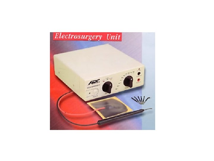 UNIDADES ELECTROQUIRURGICAS • En la electrocirugía se utiliza un equipo que transforma la energía eléctrica en calor para cortar, coagular o eliminar tejido blando. • Se generan las corrientes con frecuencias por encima de 200, 000 Hz, para evitar estimular los nervios.