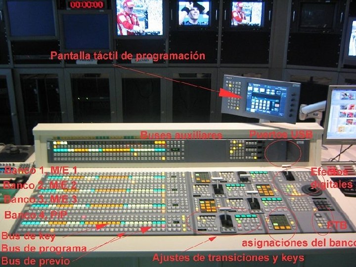 Barras de Key del switch Al final se suele añadir un módulo de key llamado DSK (dowm strik keyer, key de corriente abajo), que sirve para la introducción sencilla de una incrustación, como un subtítulo o un logo, sin interferir en la más complicada operación de un banco. Al final suele existir la posibilidad de poner la salida de un switch a negro (es decir que la imagen de salida sea un negro de color; para ello está la función FTB (Fade To Black). Un banco posee dos buses (un bus es una hilera de botones en donde cada uno de ellos está asociado a una de las señales de entrada primaria), uno de previw y otro de programa.