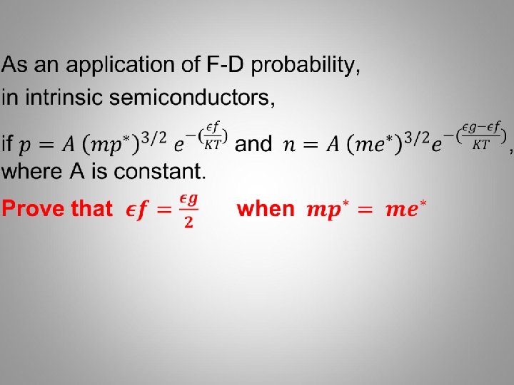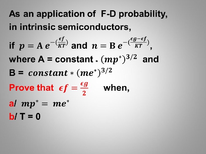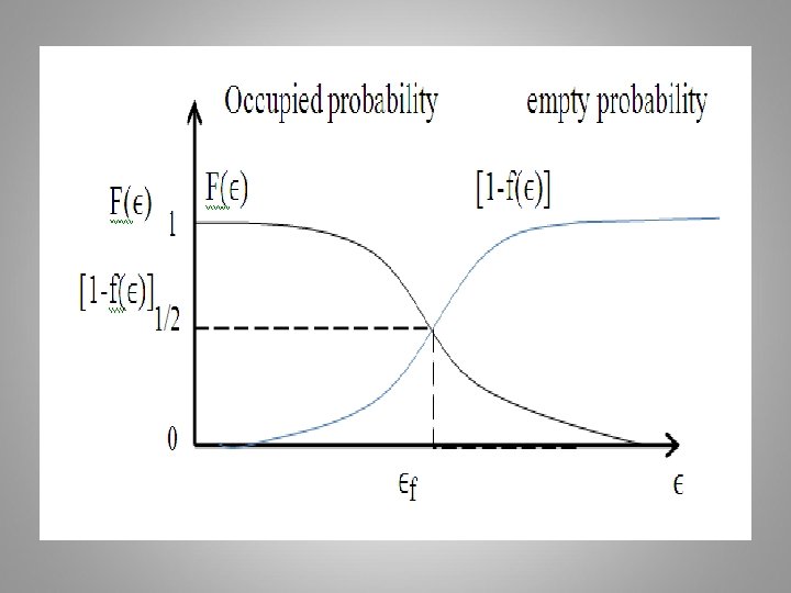 b/ = 0. 5 1+ e (E-EF)/KT = 1/0. 5 e (E-EF)/KT = (1/ 0. 5) - 1 (E – EF)/KT = Ln (1/ 0. 5 – 1) = Ln 1 =0 E - EF= 0 x KT =0 E = EF= 5. 58 e. V