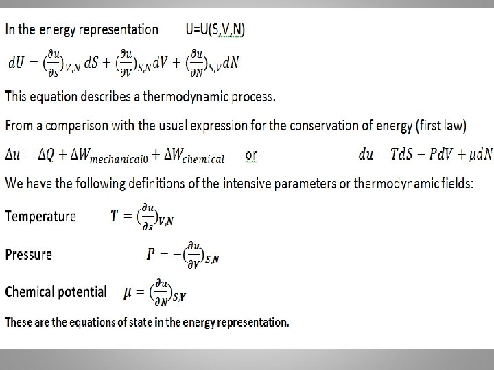 Extensive parameters of thermodynamics In the energy representation, the fundamental equation of a pure fluid is given by the relation: • U=U(S, V, N) energy representation And In the entropy is given by the relation: • S=S(U, V, N) entropy representation