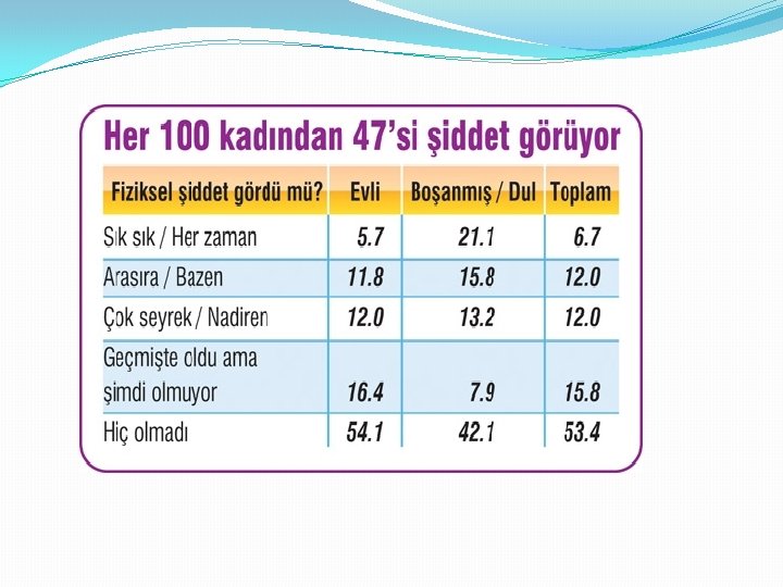 KADINA ŞİDDET � Aile içinde kadına yönelik şiddet en yaygın, buna rağmen en fazla göz ardı edilmiş insan hakkı ihlalidir. �Aile içinde kadına yönelik şiddet, bireysel nedenlerden öte daha genel sistemlerle açıklanabilecek bir olgudur. Aile içi şiddet cinsiyet kökenlidir; yani temelini cinsiyetlerin toplumsal hayattaki eksik ve kusurlu yapılanışından alır. Buna göre erkeğin uyguladığı şiddete neden olan, erkeğin kadından daha üstün ve kadın üzerinde baskı kurmasının doğal bir hak olduğuna inanılmasıdır.