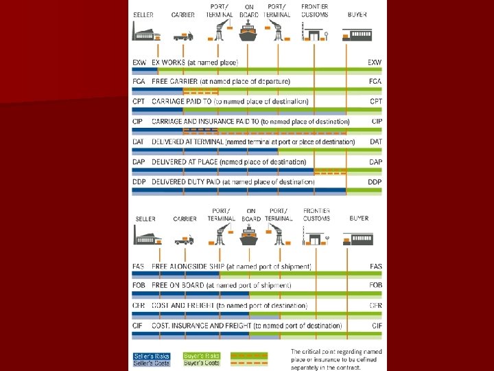 SALES –INCOTERMS n 4. carriage (either by making a contract of carriage or by arranging transport oneself) n 5. insurance (Insurance against the risk of loss or damage during carriage. For the minimum coverage to be included in insurance, Incoterms refer to the Institute Cargo Clauses (ICC) of the International Underwriting Association, specifically minimally ICC « C » clause in general (esp. CIF), but in CIP minimally « A » ). Insurance coverage required by CIF is thus only a minimal coverage (CIP requires more) n 6. proof of delivery, transport document n 7. export / import clearance (licenses, authorisations and formalities - attention in EXW: buyer must obtain export license etc. in seller’s country; attention in DDP: seller must arrange import clearance etc. ) n 8. checking, packaging, marking, inspecting n 9. allocation of costs (attention whether THC (terminal handling costs) at point of departure (for CTP and CIP) or of arrival are included or not )