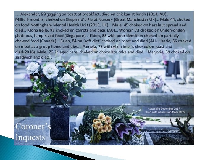 � “She should have been on a special diet of soft and pureed food…” � “she should have what was known as a 'stage three diet' - consisting only of semi-solid, soft or pureed food that could easily be digested” � “…a decision was made not to assess her directly but rely on a previous care plan” � “No new care plan was put in place and the transferred plan from Millbrook omitted any previous choking episodes, wrongly stating she could eat 'stage four foods” � “Served in her bedroom rather than in the dining area, she chose chicken was left unsupervised to eat”