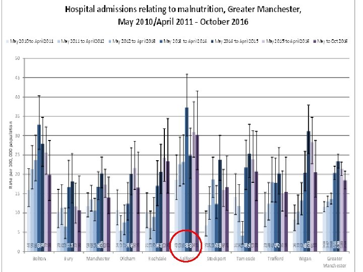 Salford Malnutrition Taskforce • A multi-agency steering group is working together to reduce the prevalence of preventable malnutrition and dehydration in Salford. Formed 5 years ago under the auspices of the national pilot in partnership with Age UK.