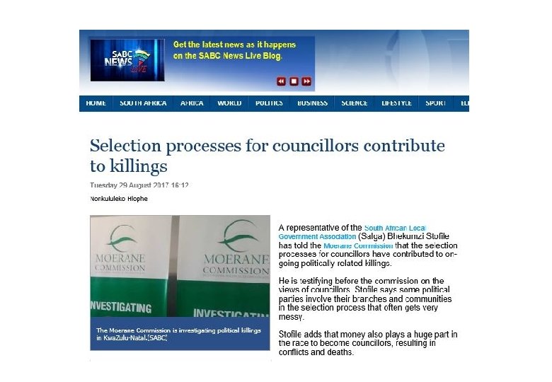 TRENDS IN COUNCILLOR KILLING, INJURIES/THREATS AND PROPERTY DESTRUCTION Councillor killings, injuries/threats and property destruction incidents (20002018) Violence tends to peak in the run up to local 2000 2001 2003 2004 2005 2006 2007 2008 2009 2010 2011 2012 2013 2014 2015 2016 2017 2018 Killings 1 2 0 0 0 1 2 0 1 3 2 2 2 13 14 5 Injuries / threats 0 0 0 0 1 0 1 9 0 7 0 5 11 6 Destruction of properties / assets 0 0 0 0 1 0 0 4 8 1 6 6 8 12 1 Source: SALGA & IEC www. salga. org. za