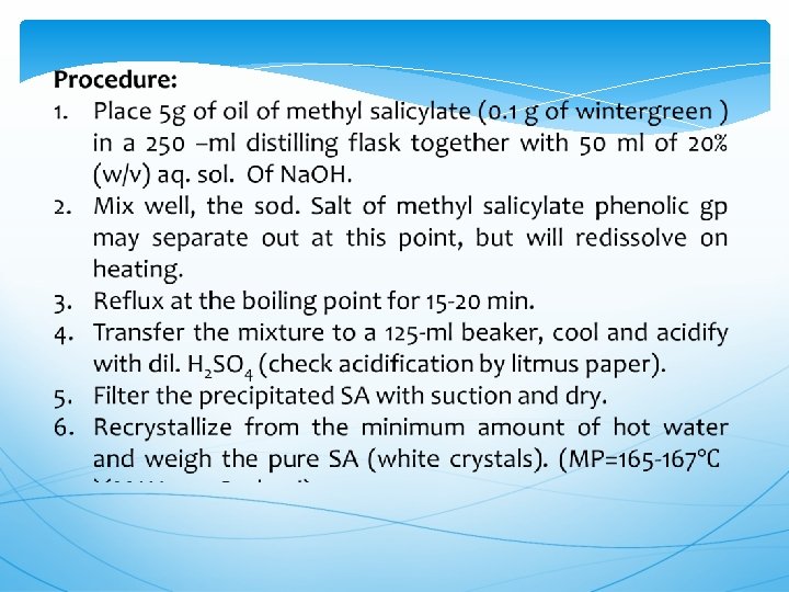 Lab. Method ( alkaline hydrolysis of ester ): SA is prepared from methyl salicylate by hydrolysis of ester group with aqueous alkali (Na. OH or KOH)