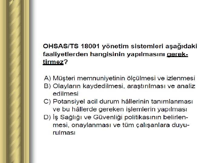 15. OHSAS 18001 yönetim sisteminde aşağıdakilerden hangisi bulunmaz? l A) Müşteri memnuniyet analizleri l B) İç ve dış denetlemeler l C) Risk değerlendirmesi l D) Acil durum planları