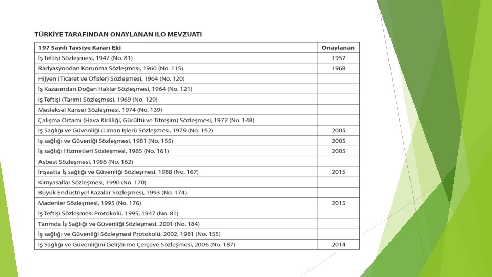 İŞ SAĞLIĞI VE GÜVENLİĞİNİN TARİHSEL GELİŞİMİ Cumhuriyet Döneminde İş sağlığı ve Güvenliği; 1920 -1921 yılında Büyük Millet Meclisinin kuruluşunu takiben, kömür madeni işçilerinin hak ve menfaatlerinin düzenlenmesi ve ayrıca işyeri koşullarını düzenlemek için başka iki kanun daha yürürlüğe konmuştur (Ereğli Havzai Fahmiyesi Maden Amelesinin Hukukuna Müteallik 151 Sayılı Yasa). Maddelerden ikisi doğrudan iş sağlığı ve güvenliğiyle ilgilidir. 1. “Kimse, yaşına, cinsiyetine ve gücüne uymayan işlerde çalıştırılamaz” (Madde 50). ü 18 yaşından küçüklerin madende çalıştırılması yasaklanmış, ü günlük çalışma süresi 8 saat ile sınırlandırılmış, ü daha fazla çalışılması durumunda daha fazla ücret ödenmesine ve bu çalışmanın karşılıklı tarafların rızasıyla yapılmasına ü İş kazaları nedeniyle ölenlerin mirasçıları da işverene karşı tazminat davası açabilecek ve kazaya neden olan işverenlere para cezası verilebilecektir. 2. “Herkes, sağlıklı ve dengeli bir çevrede yaşama hakkına sahiptir” (Madde 56).