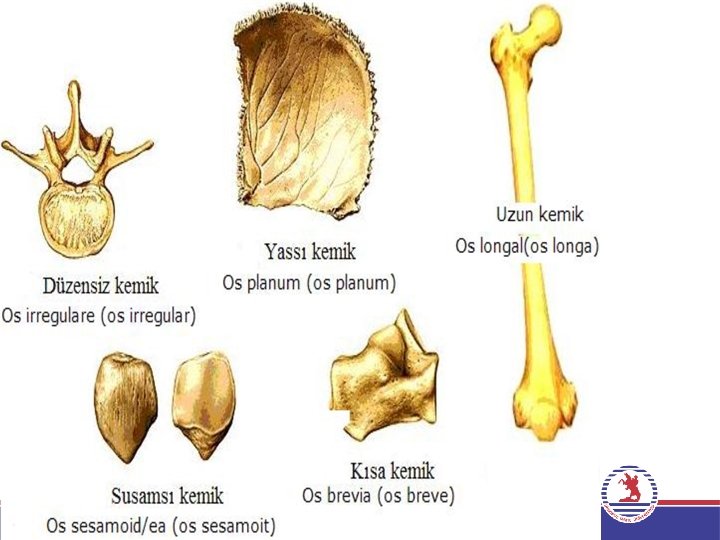 Kemik Çeşitleri • Os brevia (os breve): Kısa kemik • Os irregulare (os irregular): Düzensiz kemik • Os longal (os longa): Uzun kemik • Os planum (os planum): Yassı kemik. • Os Pneumaticum (os pnömatikum): Havalı kemik. • Os sesamoid/ea (os sesamoit): Susamsı kemik