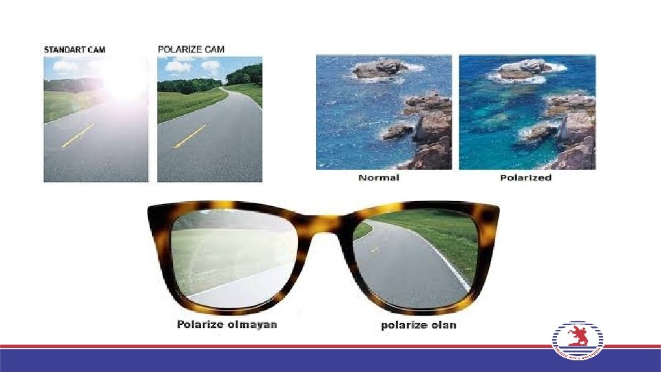 • NEDEN POLARİZASYON? • Polarize güneş gözlükleri kullanılarak, parlama ve yansıma %99 ‘a varan oranda ortadan kaldırılıp, bahsedilen rahatsızlıklar giderilir. • Parlama, su, sis, çiğ, kum, kar ve yol yüzeyi gibi yatay yüzeylerden ışığın yansımasıyla oluşur. • Televizyon seyrederken ya da bilgisayar karşısında, yani, kapalı alanlarda da parlama meydana gelebilir. • Polarizan güneş lensleri yüzeye gelen parlamaları, görüşü engellemeden emer.