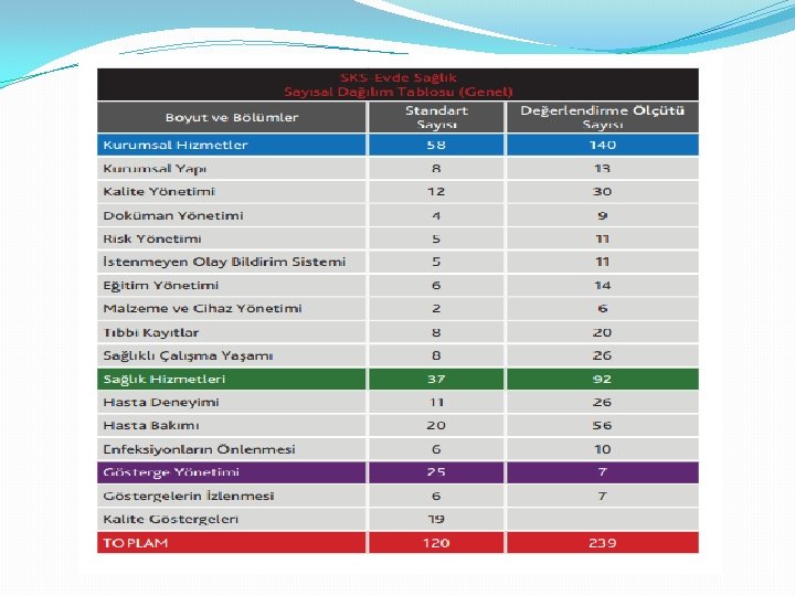 YAPISAL ÇERÇEVE § SKS Evde Sağlık; koordinasyon Merkezi ve tüm birimlerini kapsayacak tasarımda hazırlanmıştır. § SKS Evde Sağlık; boyut, bölüm ve standart ve değerlendirme ölçütleri ile rehberlikten oluşmaktadır. § SKS Evde Sağlık; 3 boyut, 14 bölüm, 120 standart, 239 değerlendirme ölçütünden oluşmaktadır.