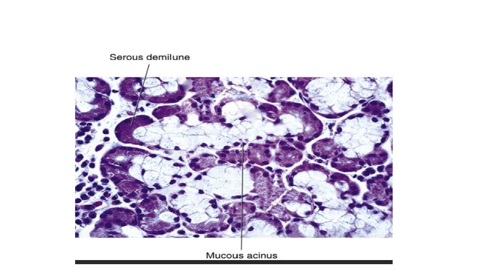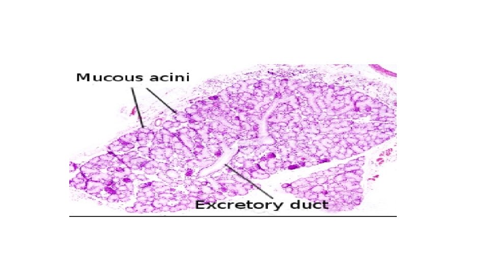 MUCOUS ACINI • The acini are is lined by low columner epithelium, is larger in size and has a bigger lumen the serous acinus • The nucleus is flattened , resting against the base ment membrane • The fresh condition the cyto plasm contais many pale droplets of mucinogen, the precursor of mucin • With H&E , The cytoplasm seems to be vacuolated • With periodic acidic schiuff (PAS) stain , the cytoplasm takes up of mejenta colour.